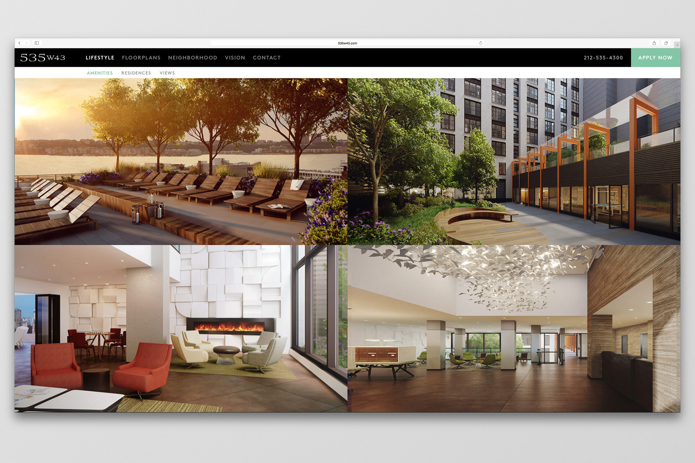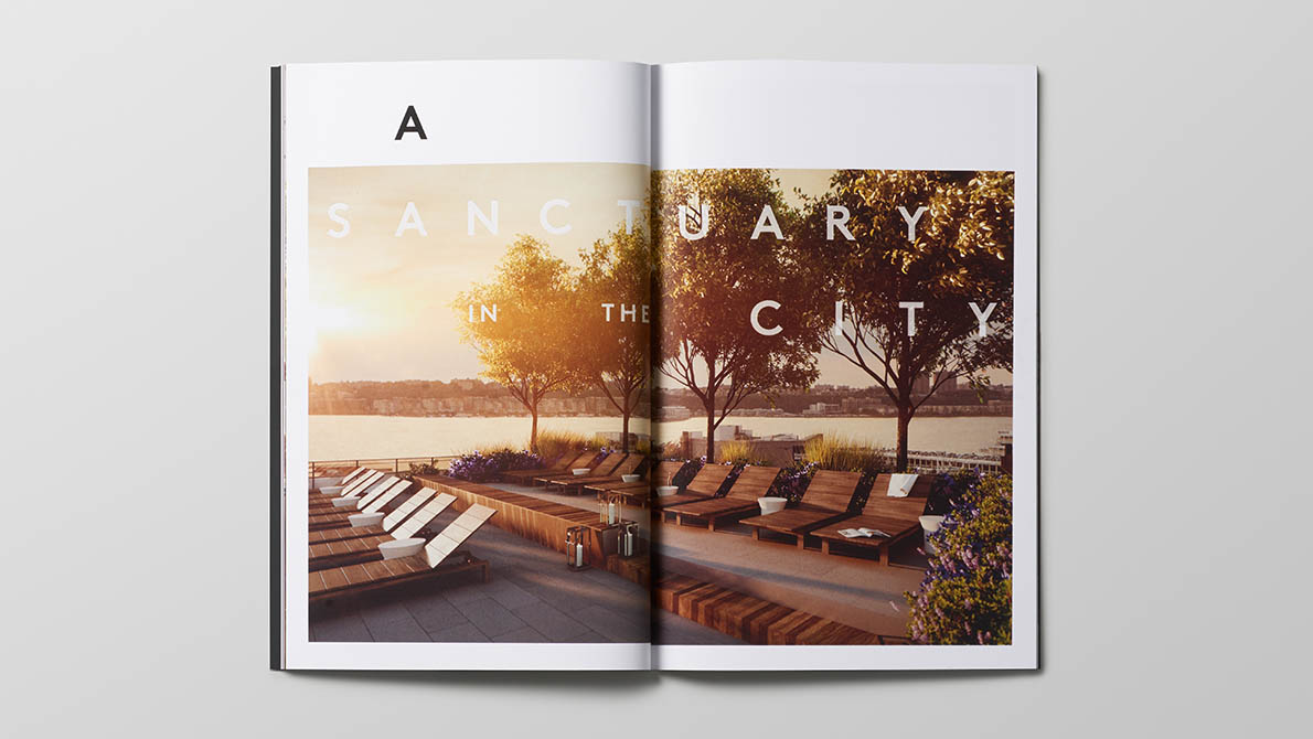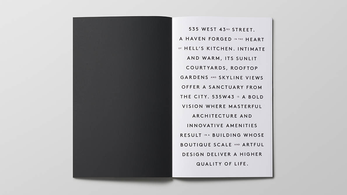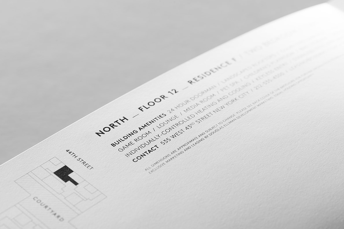 Branding, collateral, and leasing center design for the new construction residential rental development in the Hell’s Kitchen neighborhood of Manhattan.